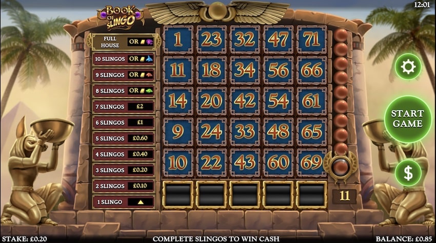 The game derives from a combination of slots and bingo with each game taking a minute or two to play out. The screen displays a 5×5 grid that looks much like a 75-ball bingo card with 25 random numbers revealed. Once the game starts, instead of a bingo caller, numbers are chosen by the spin of a reel that sits under the card. In each game players normally start with 10 or 11 spins, though the number can change dependent on which version of Slingo you are playing.