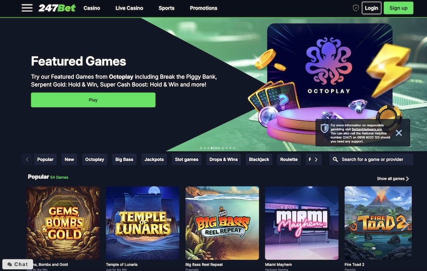 247Bet offers an excellent selection of games which is also well presented and easy to explore. There are slots, live dealer tables, Slingos, scratchcards, plinkos, keno and video poker. And of course, a massive sportsbook too with 100s of markets.