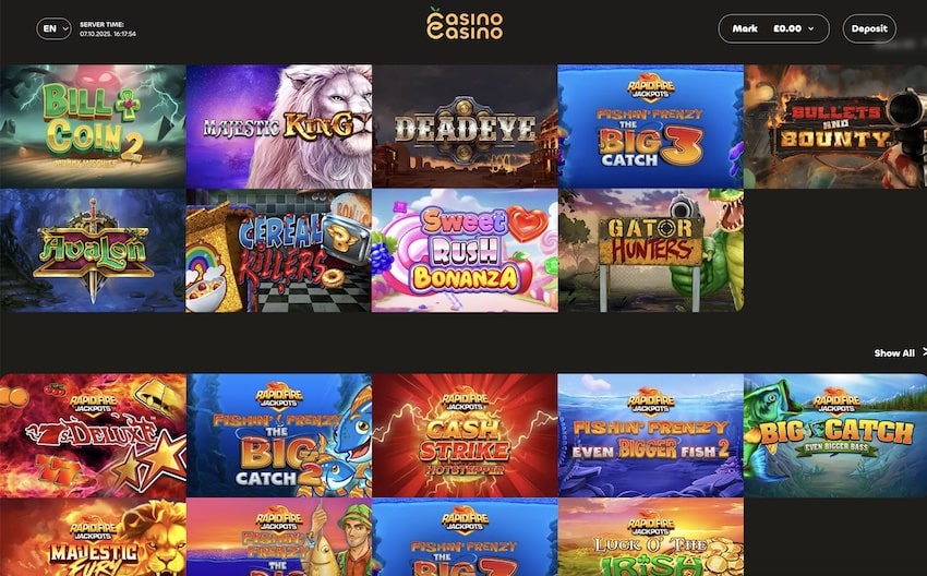 - Fewer games than other sites – if you are after a big, big game list then CasinoCasino won’t be for you. There are around 1,000 slots, far less than what you find at sites like Mega Riches.