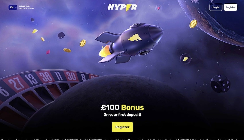 To claim this offer you must be a new customer to Hyper Casino with no previous account. You should register and make a first deposit of £10 or more.
