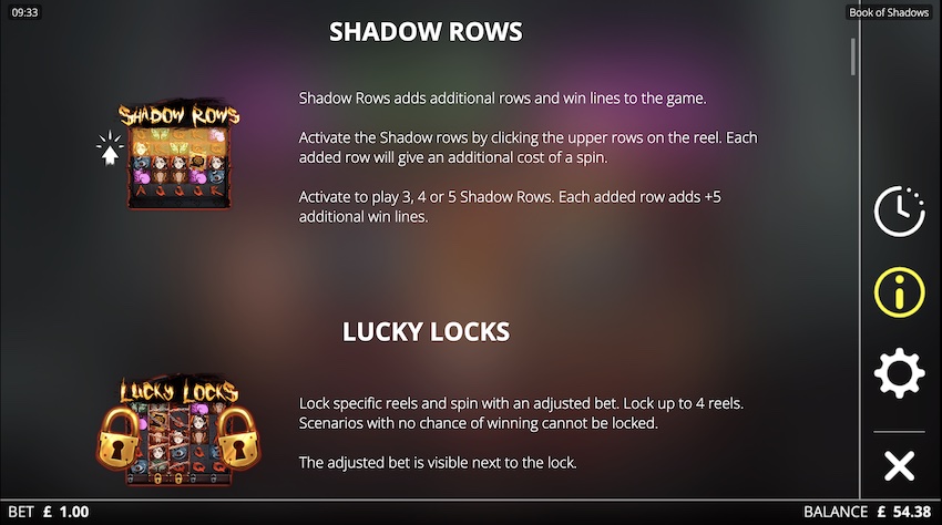 One of the parts I liked best about this game was the ability to choose your own configuration of lines, row and RTP. It’s certainly a game for those who like to consider their bets before placing them. And its another feature that sets Book of Shadows apart from the rest. So think carefully before you spin.