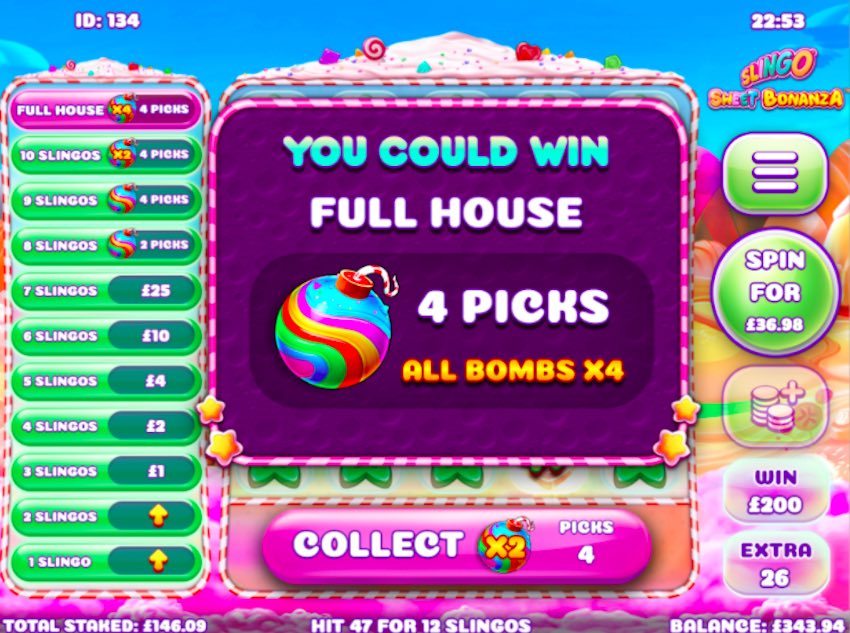 The bonus round can be triggered either by hitting 8 or more Slingos or by landing three or more bonus icons on the reel in one spin. Those who have played Pragmatic Play’s Sweet Bonanza Slot will recognise the Sugar Bomb bonus symbols from that game. They appear in the Pick Me screen and you must choose one from four to reveal a multiplier value that is applied to your win so far.